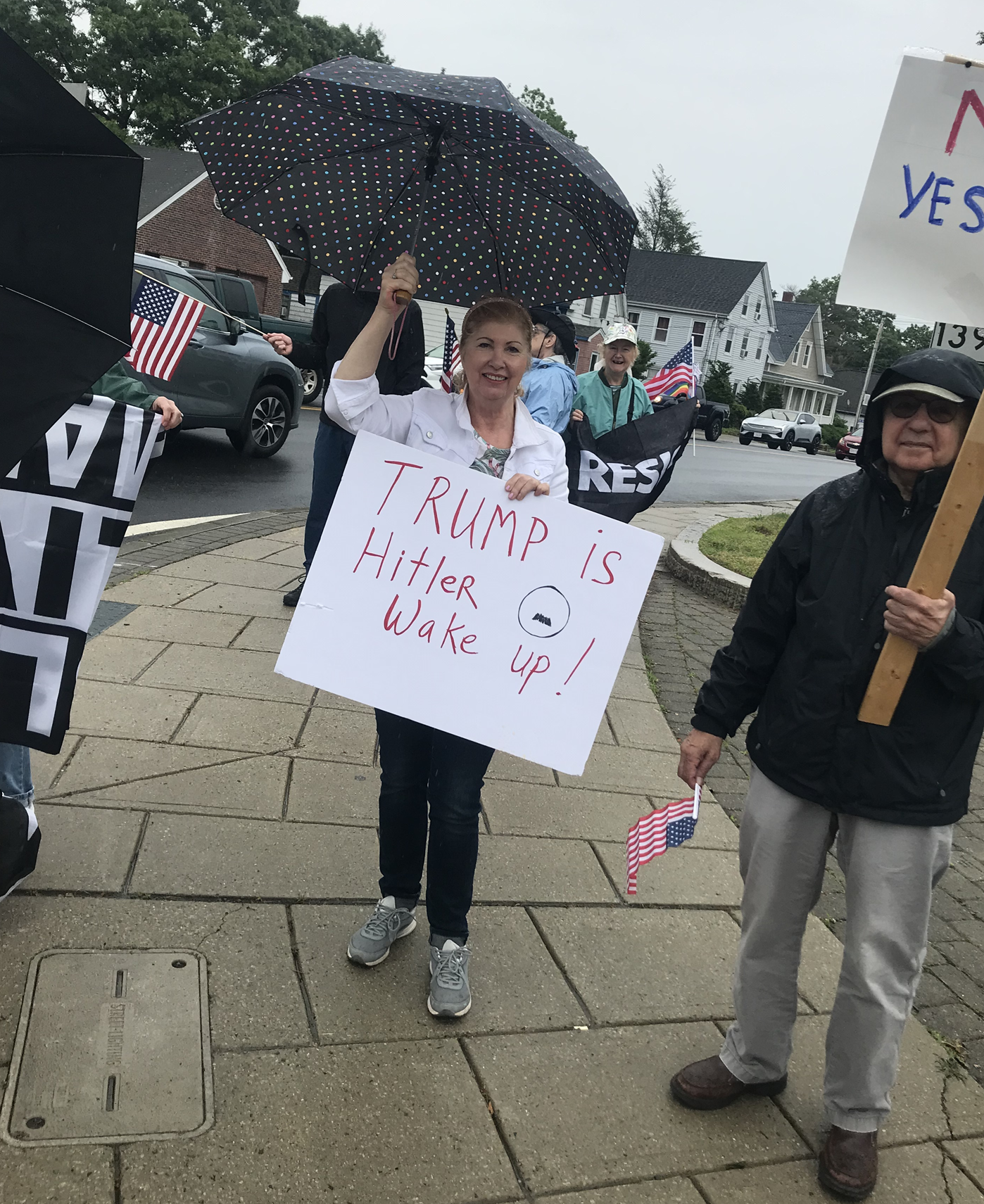 Below left is Kathleen Crogan-Camara making the connection, by moustache, of Trump and Hitler.