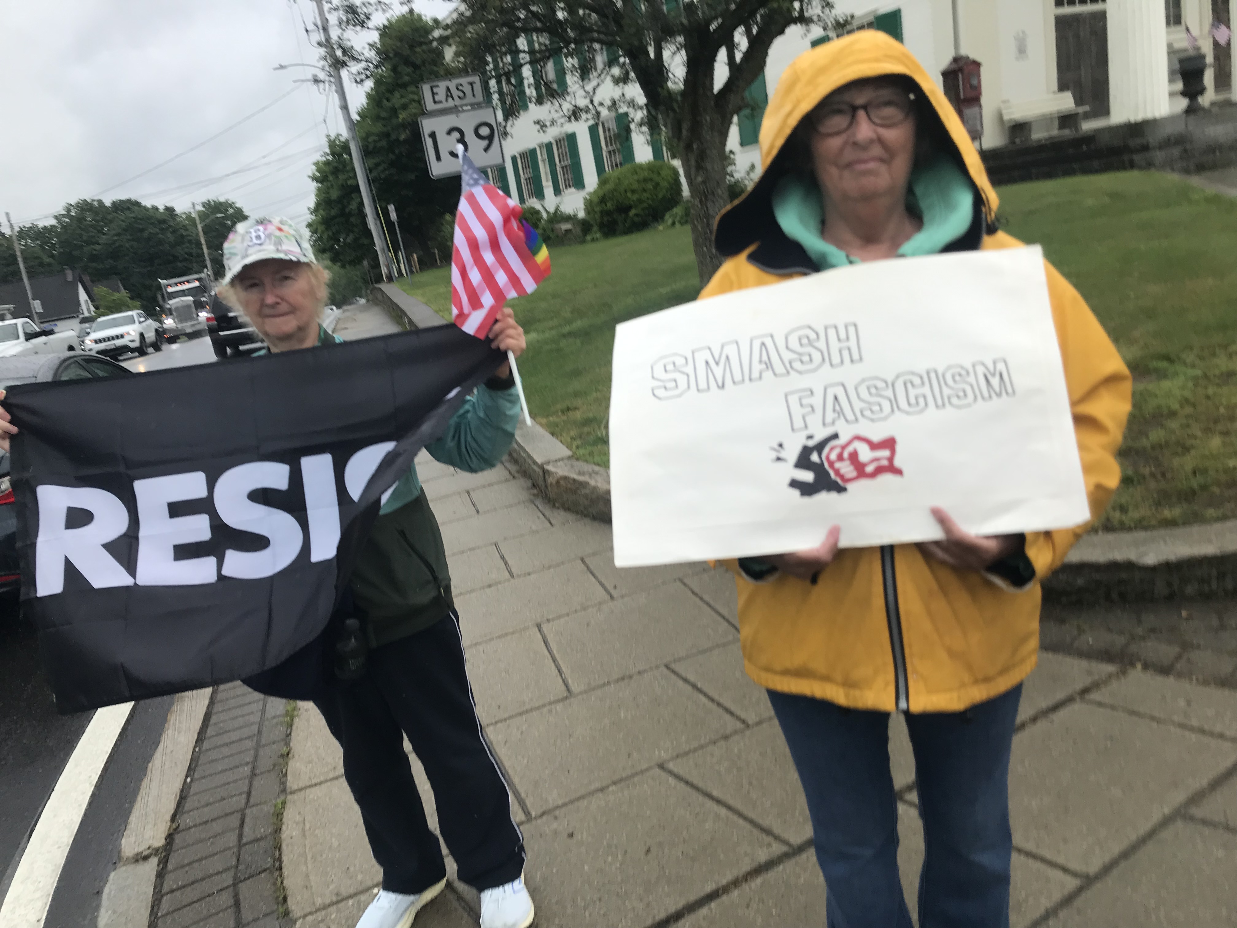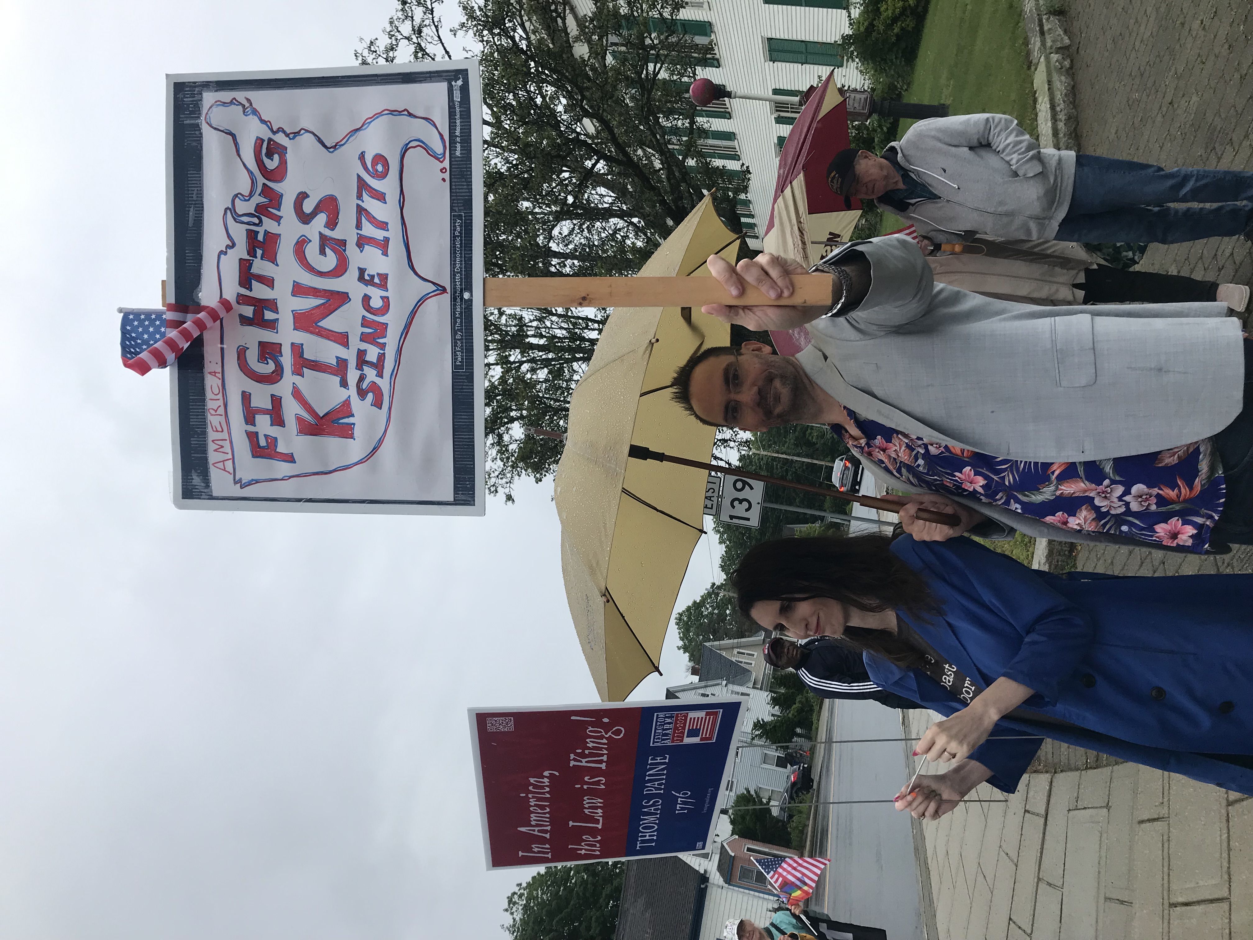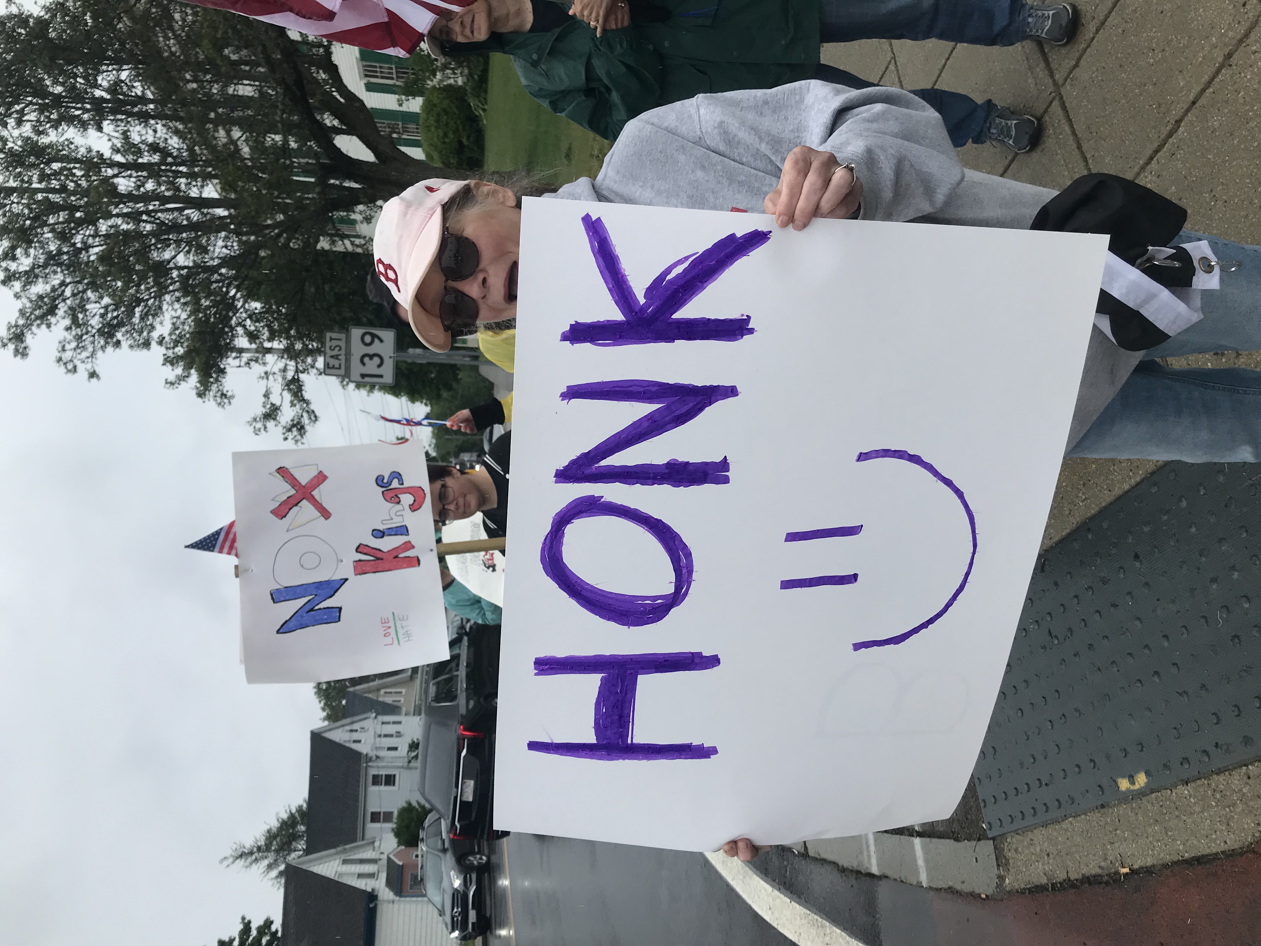 Over five million people attended over 2,000 rallies nationwide on June 14, including in Randolph. Some of them had nicely-printed signs, but I think the hand-made signs say a lot more. My sign, to the right, says "America: Fighting Kings Since 1776". Here's a sample from Stetson Hall in Crawford Square...